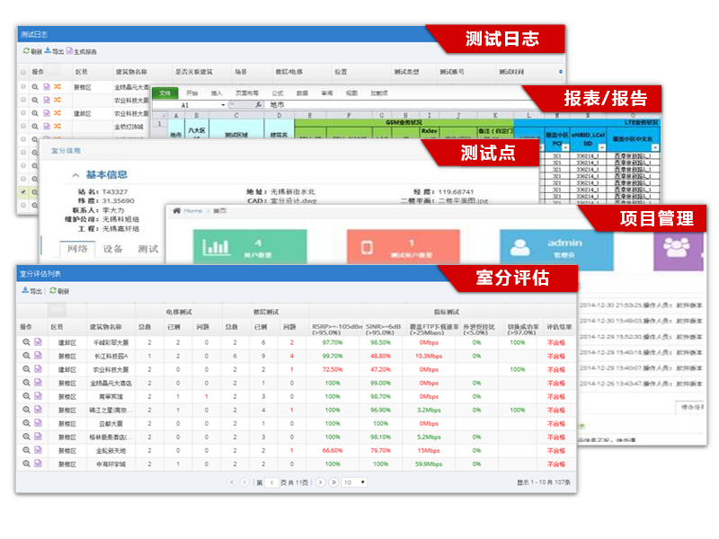 平臺側采用工業級標準的J2EE平臺,具有很強的安全性和可擴展性。平臺端功能同樣強大,提供了項目管理、測試點管理、測試日志管理與分析、室分評估、一鍵式報表/報告生成等功能。