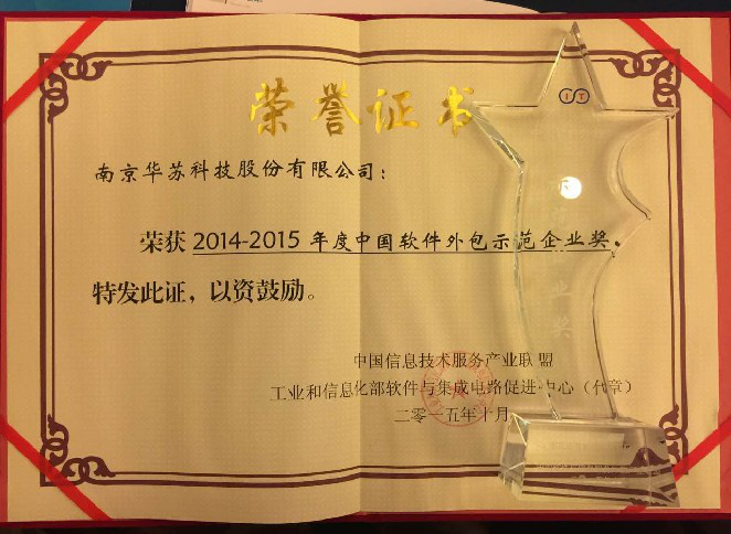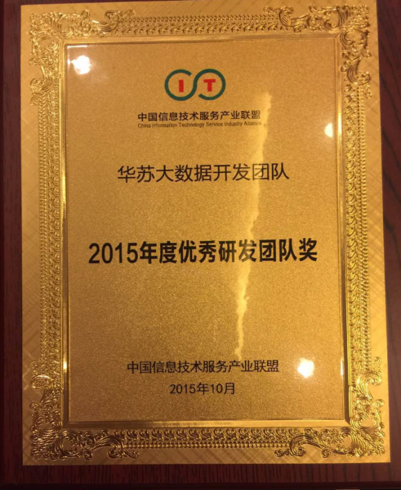 熱烈慶祝華蘇榮獲”2014-2015年度中國軟件外包示范企業(yè)獎“,研發(fā)大數(shù)據(jù)團隊榮獲“2015年度優(yōu)秀研發(fā)團隊獎”