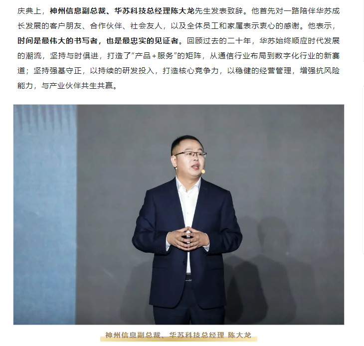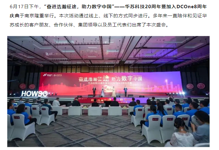 :6月17日下午,“奮進浩瀚征途,助力數字中國”——華蘇科技20周年暨加入DCOne8周年慶典于南京隆重舉行。