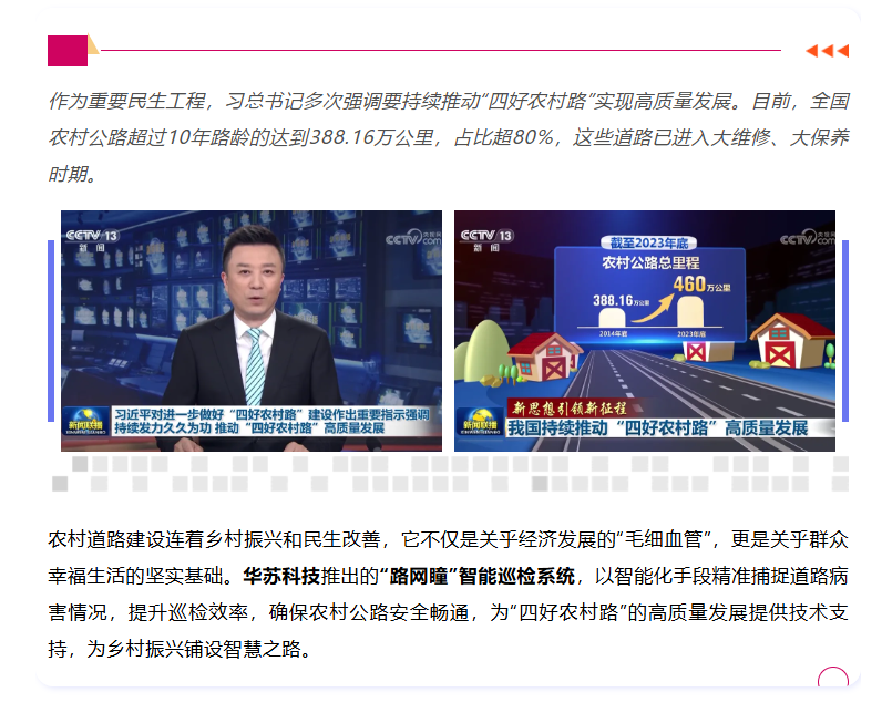 華蘇科技 推出的“路網(wǎng)瞳”智能巡檢系統(tǒng),以智能化手段精準(zhǔn)捕捉道路病害情況,提升巡檢效率,確保農(nóng)村公路安全暢通,