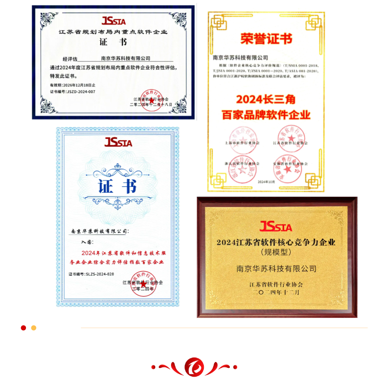 華蘇科技 憑借卓越的技術實力、創新能力和市場影響力榮獲“江蘇省規劃布局內重點軟件企業”、“2024長三角百家品牌軟件企業”、“2024江蘇省軟件核心競爭力企業(規模型)”、“2024年江蘇省軟件和信息技術服務業企業綜合實力評估指數百家企業”四項殊榮。