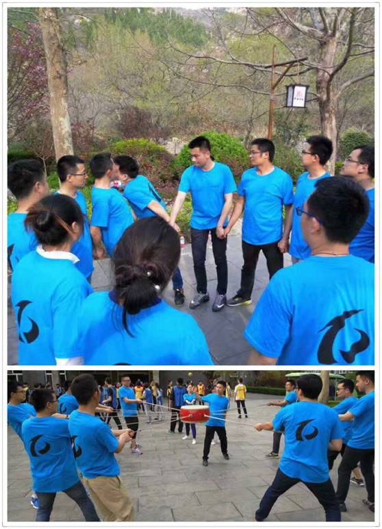 拓展訓練中還有,鼓動人心(團隊成員每人手拉一根繩子,用鼓面來擊球),群龍取水(借助團隊所有成員幫助,將自己身體完全交給隊友,筆直的放心身體,拿取指定范圍內(nèi)的水瓶)讓我們深刻體會到團隊合作的重要性,更加的感悟到理解與相信,是方便留給自己還是留給隊友。